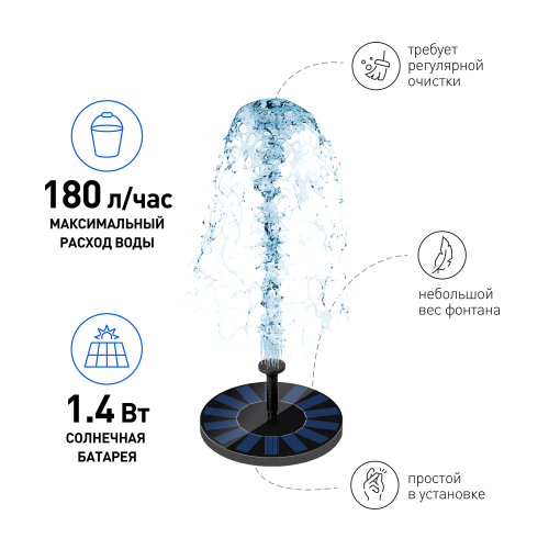Green Apple GAPF-01 (арт. Б0057671) – плавающий садовый фонтан с водяным насосом, работающим от встроенной солнечной батареи. Новинка рынка садовых фонтанов! Идеален для декора садового пруда. Водяной поток высотой до 1 метра. Фонтан автоматически заряжается в течение всего светового дня. Мощность солнечной панели – 1,4 Вт. В числе преимуществ минималистичная конструкция, простая сборка и установка, небольшой вес. И конечно – встроенная светодиодная подсветка! Благодаря ярким LED-лампочкам фонтан будет эффектно светиться в вечернее время, преображая пруд и придавая загородной территории волшебный вид. LED-подсветка автоматически включается с наступлением сумерек.