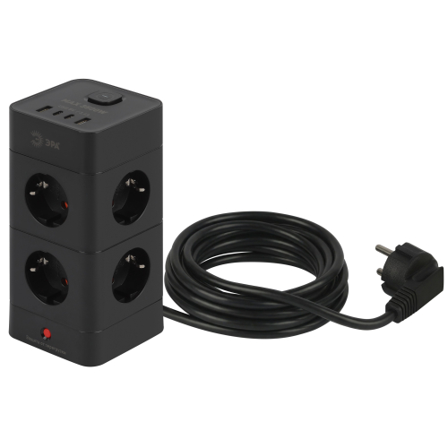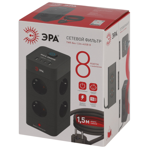 Сетевой фильтр Эра TWR-8es-1,5m-4USB-B рассчитан на одновременное подключение большого количества техники. На корпусе расположены 8 розеток с заземлением. Прочный корпус в виде башни из негорючего поликарбоната. Блок защиты подключаемых устройств включает термореле для защиты от короткого замыкания и перегрузки. При нагреве из-за превышения нагрузки термореле срабатывает и обесточивает все подключенные устройства. Трехжильный провод ПВС обеспечивает допустимую максимальную нагрузку до 3680 Вт. Правильно подбирайте бытовые приборы, чтобы не превышать общую нагрузку на сетевой фильтр. 4xUSBA+C 3,4A 5В~ 18Вт. Длина провода модели составляет 1,5 метра. Удлинитель удобно использовать в пределах одной комнаты.