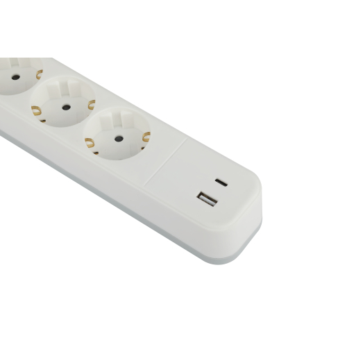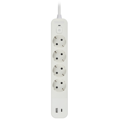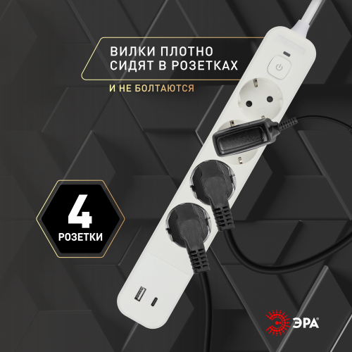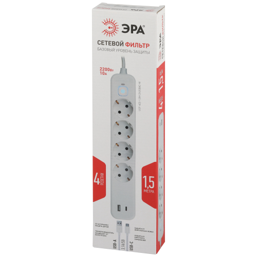 Сетевой фильтр ЭРА USF-4es-1,5m-2xUSBAC-W с заземлением, с выключателем, 4 розетки, 2USB, провод 1,5 м, ПВС 3x0,75мм2. Базовый уровень защиты техники: от импульсных помех, от перегрузки, от короткого замыкания. Максимальная мощность 10А/2200 Вт. Корпус из негорючего пластика (полипропилен). Вилка обеспечена кольцом для удобного извлечения ее из розетки. Выключатель со световой индикацией позволяет выключить все приборы, подключенные к сетевому фильтру, не вынимая вилки из розетки. Отлично подойдет для защиты бытовой и компьютерной техники. Сетевой фильтр оснащен 2USB для зарядки мобильных устройств.