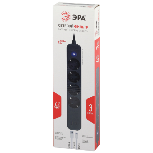 Сетевой фильтр ЭРА USF-4es-3m-2xUSBAC-B с заземлением, с выключателем, 4 розетки, 2USB, провод 3м, ПВС 3x0,75мм2. Базовый уровень защиты техники: от импульсных помех, от перегрузки, от короткого замыкания. Максимальная мощность 10А/2200 Вт. Корпус из негорючего пластика (полипропилен). Вилка обеспечена кольцом для удобного извлечения ее из розетки. Выключатель со световой индикацией позволяет выключить все приборы, подключенные к сетевому фильтру, не вынимая вилки из розетки. Отлично подойдет для защиты бытовой и компьютерной техники. Сетевой фильтр оснащен 2USB для зарядки мобильных устройств.