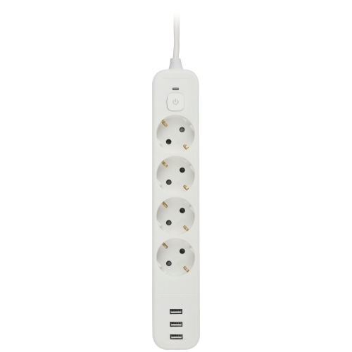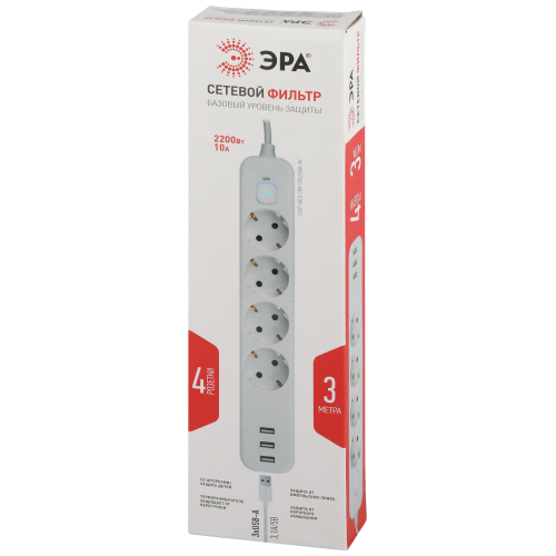 Сетевой фильтр ЭРА USF-4es-3m-3xUSBA-W с заземлением, с выключателем, 4 розетки, 3USB, провод 3м, ПВС 3x0,75мм2. Базовый уровень защиты техники: от импульсных помех, от перегрузки, от короткого замыкания. Максимальная мощность 10А/2200 Вт. Корпус из негорючего пластика (полипропилен). Вилка обеспечена кольцом для удобного извлечения ее из розетки. Выключатель со световой индикацией позволяет выключить все приборы, подключенные к сетевому фильтру, не вынимая вилки из розетки. Отлично подойдет для защиты бытовой и компьютерной техники. Сетевой фильтр оснащен 3USB для зарядки мобильных устройств.