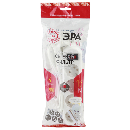 Сетевой фильтр ЭРА USF-M-4es-1.5m-W с защитой от перегрузки сети по-настоящему необходим в современном доме. Он позволяет подключить к сети сразу несколько устройств, при этом защищает от короткого замыкания. Корпус универсального цвета имеет 4 розетки, каждая из которых имеет заземление. Сетевой фильтр можно использовать как удлинитель с проводом 1,5 метра, который при необходимости можно перемещать в пределах квартиры. Его мощность составляет 2200 Вт. На корпусе расположена клавиша быстрого выключения всего устройства, что особенно удобно в случае необходимости экстренного отключения от сети. Характеристики сетевого фильтра ЭРА позволяют ему по праву быть необходимым аксессуаром в современном доме. Сетевые фильтры ЭРА разрабатываются собственным техническим бюро, проходят проверку на всех этапах производства, что обеспечивает высокое качество продукта.