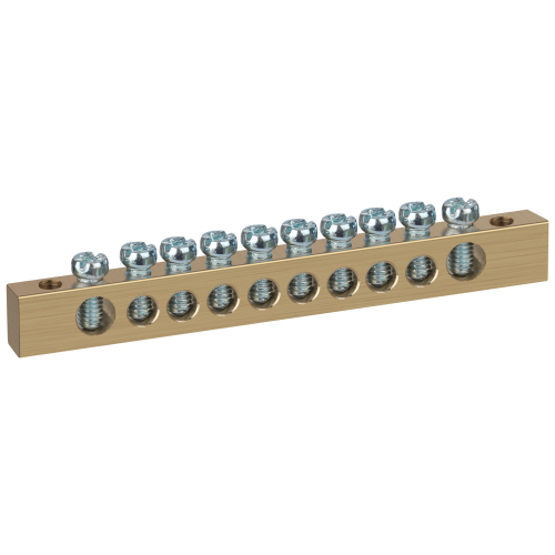 Шины латунные PEN "земля-ноль" применяются для электрического и механического соединения нулевых, защитных и фазных проводников в электрических щитах и распределительных устройствах. Изделия выполняются из латуни соответствующего сечения с отверстиями обладающими винтовыми зажимами для подключения проводников.