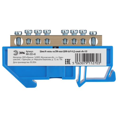 Шины латунные N «нейтраль» 6×9 на DIN-изоляторе применяются для электрического и механического соединения нулевых, защитных и фазных проводников в электрических щитах и распределительных устройствах. Изделия выполняются из латуни соответствующего сечения с отверстиями, обладающими винтовыми зажимами для подключения проводников. Шины установлены на пластиковый изолятор, изготовленный из полипропилена с добавлением антипиренов. Конструкция изолятора обладает креплением для установки на DIN-рейку. Цвет изолятора (синий/жёлтый) позволяет быстро и правильно идентифицировать тип подключаемого проводника.