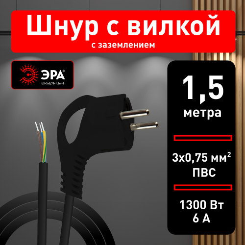 Шнур питания с вилкой UX-3x0,75-1,5m-B с заземлением, провод ПВС с сечением 3х0,75, длина 1,5 м, цвет - черный. Провод шнура питания состоит из скрученных жил с надежной ПВХ оболочкой. На конце шнура имеется штепсельная вилка. Изделие предназначено для комплектации или ремонта электрических бытовых приборов.