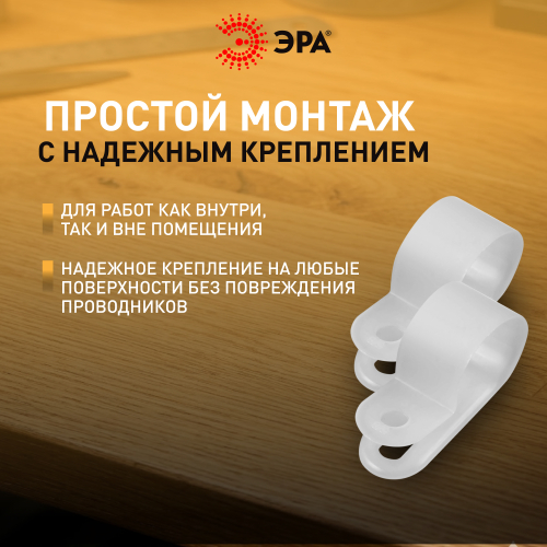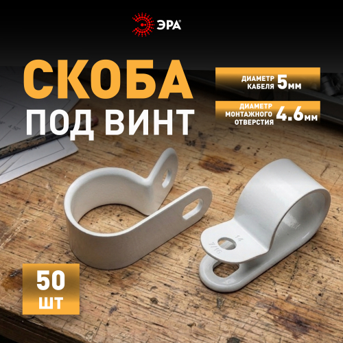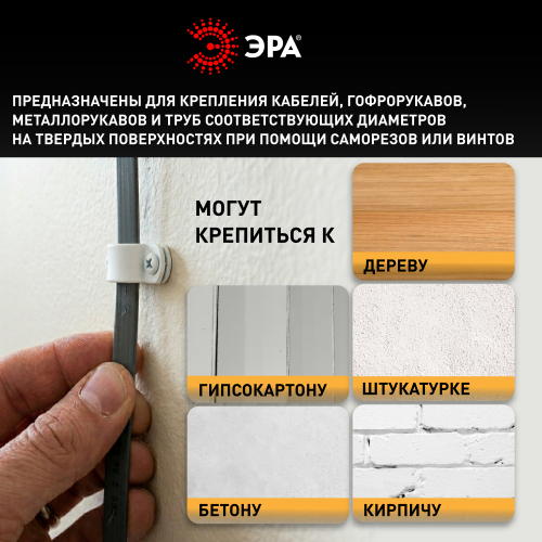 Скобы крепежные нейлоновые под винт ЭРА предназначены для фиксации отдельных кабелей, пучка проводов, гофрорукавов соответствующих диаметров. Это один из наиболее экономичных видов крепежа. Вы самостоятельно можете выбрать наиболее подходящий либо имеющийся у вас в наличии вид крепежа данной скобы к поверхности: саморез, винт с дюбелем и т. п.