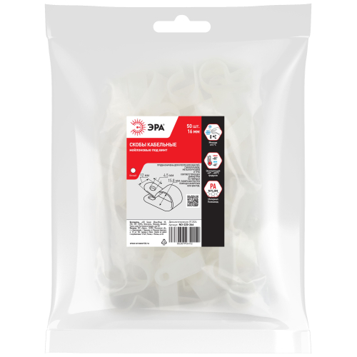 Скобы крепежные нейлоновые под винт ЭРА предназначены для фиксации отдельных кабелей, пучка проводов, гофрорукавов соответствующих диаметров. Это один из наиболее экономичных видов крепежа. Вы самостоятельно можете выбрать наиболее подходящий либо имеющийся у вас в наличии вид крепежа данной скобы к поверхности: саморез, винт с дюбелем и т. п.