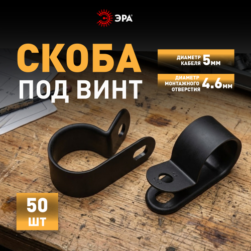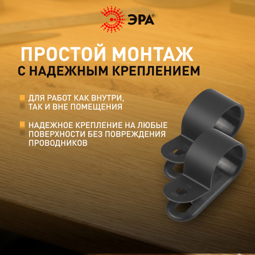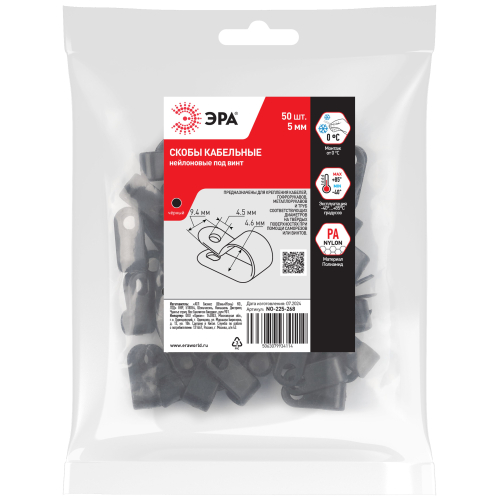 Скобы крепежные нейлоновые под винт ЭРА предназначены для фиксации отдельных кабелей, пучка проводов, гофрорукавов соответствующих диаметров. Это один из наиболее экономичных видов крепежа. Вы самостоятельно можете выбрать наиболее подходящий либо имеющийся у вас в наличии вид крепежа данной скобы к поверхности: саморез, винт с дюбелем и т. п.