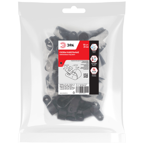 Скобы крепежные нейлоновые под винт ЭРА предназначены для фиксации отдельных кабелей, пучка проводов, гофрорукавов соответствующих диаметров. Это один из наиболее экономичных видов крепежа. Вы самостоятельно можете выбрать наиболее подходящий либо имеющийся у вас в наличии вид крепежа данной скобы к поверхности: саморез, винт с дюбелем и т. п.