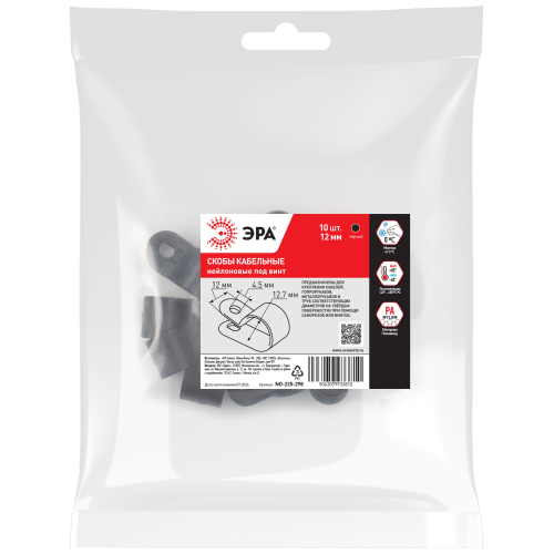 Скобы крепежные нейлоновые под винт ЭРА предназначены для фиксации отдельных кабелей, пучка проводов, гофрорукавов соответствующих диаметров. Это один из наиболее экономичных видов крепежа. Вы самостоятельно можете выбрать наиболее подходящий либо имеющийся у вас в наличии вид крепежа данной скобы к поверхности: саморез, винт с дюбелем и т. п.