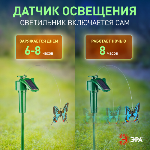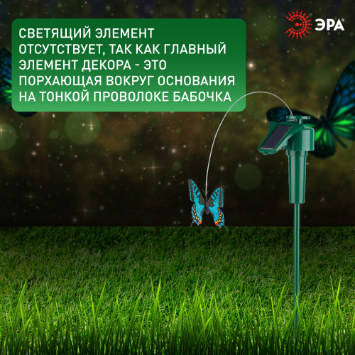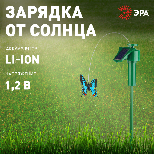 Садово-парковая декоративная композиция SL-PL42-BTF "Порхающая бабочка" станет необычным украшением Вашей дачной территории. Уличная декоративная фигурка подойдет для размещения в клумбе, кустарниках или при входе в террасу. Модель имеет высоту в 42 см и без труда вставляется в землю. Функционирует на солнечной батарее. Такой способ получения энергии является самым экологичным, энергоемким, а также бесшумным. Питание происходит во включенном режиме, днем. Светящийся элемент отсутствует, так как главная особенность декора - это цветная бабочка на тонкой проволоке, эффектно "летающая" вокруг основания. Высокий уровень пыле и влагозащиты позволяет оставлять композицию на улице даже во время дождя. Обращаем Ваше внимание, что перед использованием фигурки её необходимо включить и зарядить. Заряжается в течение всего светового дня. Садовая фигура "Порхающая бабочка" на солнечной батарее от бренда ЭРА – чудесный вариант для преображения Вашего участка.