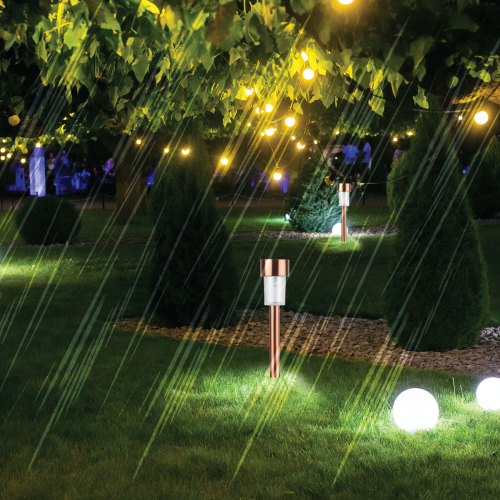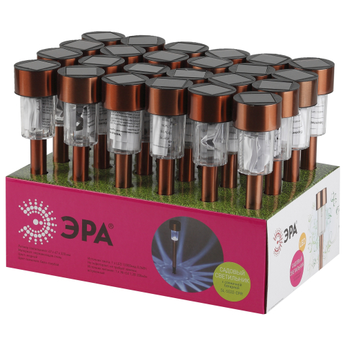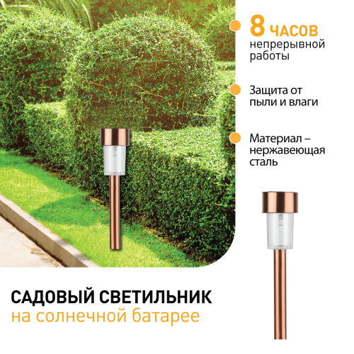 Стальной более представительный аналог бюджетная модели садового светильника классической формы. Белый светодиод. Оригинальное "медное" покрытие. Поставляется в промоупаковке по 24 штуки.