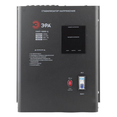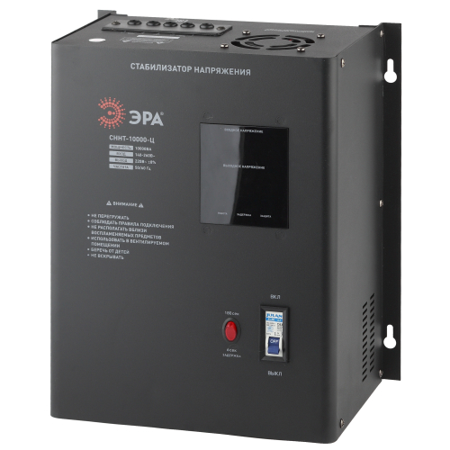 Стабилизатор напряжения настенный однофазный релейный цвет чёрный модели СННТ-10000-Ц. Номинальные характеристики (полная мощность / диапазон входного напряжения): 10000ВА 140-260В . Предназначен для поддержания стабильного однофазного напряжения питания бытовых приборов при отклонениях значений сетевого напряжения. Выбирая стабилизатор, нужно знать, какое электрооборудование будет к нему подключено: один прибор, группу приборов (наиболее чувствительных к перепадам напряжения в сети) либо вся домашняя (офисная) техника. Затем необходимо рассчитать суммарную мощность защищаемых электропотребителей. Основное условие выбора мощности стабилизатора напряжения - суммарная мощность подключаемой к нему нагрузки не должна превышать полной мощности самого стабилизатора (в противном случае автоматика стабилизатора будет их просто отключать). Точные значения мощности можно узнать из паспортных данных Вашего конкретного потребителя. Стабилизатор подбирается с запасом в 25-30% к его полной мощности.