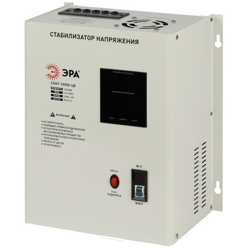 Стабилизатор напряжения настенный однофазный релейный с цифровым дисплеем цвет белый модель СННТ-10000-ЦБ. Номинальные характеристики (полная мощность / диапазон входного напряжения): 10000ВА 140-260В . Предназначен для поддержания стабильного однофазного напряжения питания бытовых приборов при отклонениях значений сетевого напряжения. Выбирая стабилизатор, нужно знать, какое электрооборудование будет к нему подключено: один прибор, группу приборов (наиболее чувствительных к перепадам напряжения в сети) либо вся домашняя (офисная) техника. Затем необходимо рассчитать суммарную мощность защищаемых электропотребителей. Основное условие выбора мощности стабилизатора напряжения - суммарная мощность подключаемой к нему нагрузки не должна превышать полной мощности самого стабилизатора (в противном случае автоматика стабилизатора будет их просто отключать). Точные значения мощности можно узнать из паспортных данных Вашего конкретного потребителя. Стабилизатор подбирается с запасом в 25-30% к его полной мощности.