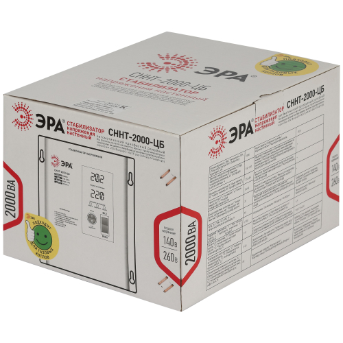 Стабилизатор напряжения настенный однофазный релейный с цифровым дисплеем цвет белый модель СННТ-2000-ЦБ. Номинальные характеристики (полная мощность / диапазон входного напряжения): 2000ВА 140-260В . Предназначен для поддержания стабильного однофазного напряжения питания бытовых приборов при отклонениях значений сетевого напряжения. Выбирая стабилизатор, нужно знать, какое электрооборудование будет к нему подключено: один прибор, группу приборов (наиболее чувствительных к перепадам напряжения в сети) либо вся домашняя (офисная) техника. Затем необходимо рассчитать суммарную мощность защищаемых электропотребителей. Основное условие выбора мощности стабилизатора напряжения - суммарная мощность подключаемой к нему нагрузки не должна превышать полной мощности самого стабилизатора (в противном случае автоматика стабилизатора будет их просто отключать). Точные значения мощности можно узнать из паспортных данных Вашего конкретного потребителя. Стабилизатор подбирается с запасом в 25-30% к его полной мощности.