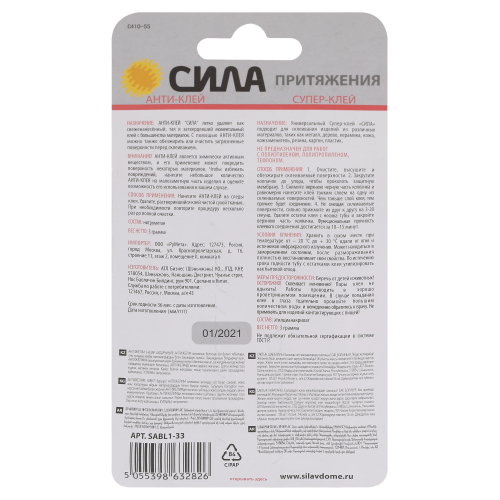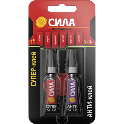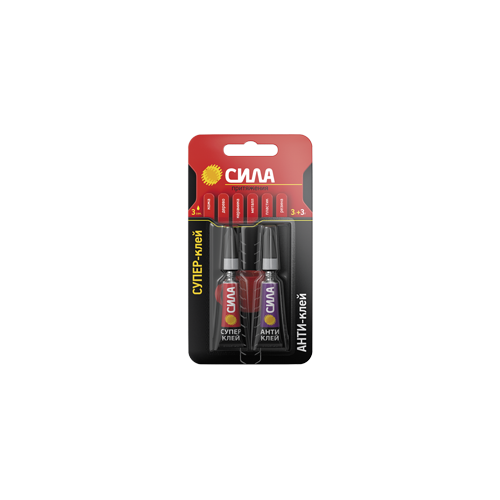 Супер-клей и Антиклей на одном блистере. Супер-клей СИЛА, идеально подходит для быстрого и эффективного ремонта различных предметов мебели, интерьера и т.д. Накрепко схватывает дерево, резину, фарфор и пластик, при этом супер клеи экономично расходуются и высыхают за несколько секунд. Антиклей предназначен для удаления как свеженанесённого, так и затвердевшего моментального клея с большинства материалов. С помощью антиклея можно также обезжирить или очистить загрязнённые поверхности перед склеиванием.