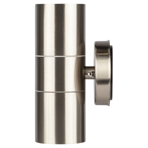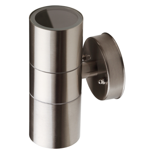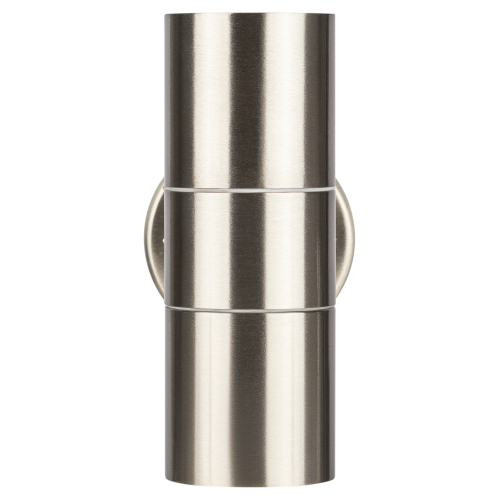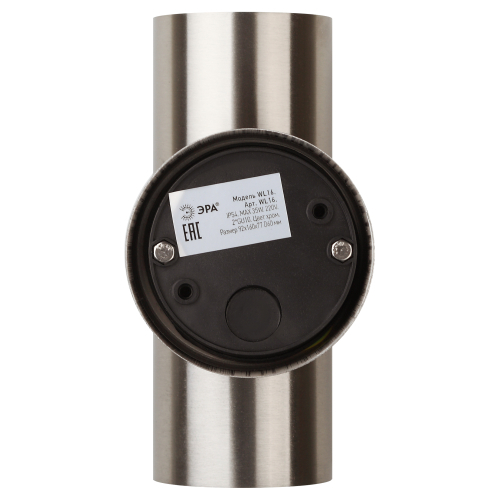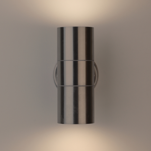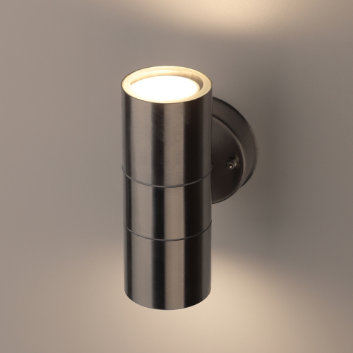Светильник декоративный настенный WL16 создает интересные световые композиции, подчеркивает структуру материалов. Подходит для наружного уличного освещения и влажных помещений. Цоколь для источника света GU10, напряжение питания 220В ~50/60Гц, материал нержавеющая сталь + пластик, цвет светильника хром, размер 92*160*77 мм, D60 мм, максимальная мощность лампы 50 Вт, степень защиты IP44