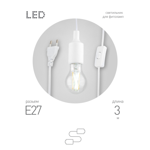 Новый светильник ЭРА FITO-Holder E27 3м с проводом длиной 3 м и выключателем идеально подойдет для любых фитоламп ЭРА с цоколем Е27.