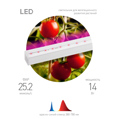 Линейный фитосветильник ЭРА FITO-14W-Т5-N красно-синего спектра, мощность — 14 Вт. Ускоряет фотосинтез, эффективен для вегетационного развития растений. Вся энергия свечения распределяется на две длины волны — 660 и 440 нм, что в разы ускоряет фотосинтез. В единую цепь можно помещать до 14 таких светильников общей мощностью до 140 Вт. Соединять светильники между собой легко вручную — за считанные секунды и без специальных инструментов. Корпус изготовлен из прочного пластика и отличается хорошим теплоотводом за счёт плотного прилегания печатной платы к основанию.