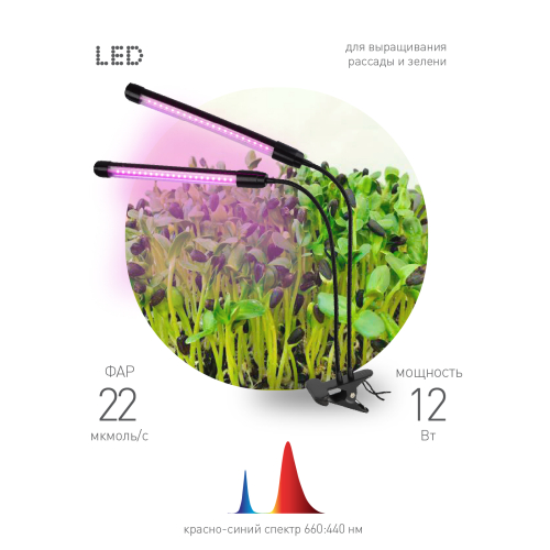 ЭРА CROCUS — удобный домашний фитосветильник на прищепке, в чёрном корпусе, с двумя LED-модулями. Можно быстро разместить в любом месте дома, просто зафиксировав прищепку на столешнице или полке. Мощность — 12 Вт. Фотонный поток — 22 мкмоль/с. Шнур — 130 см, двойной. Каждый светодиодный модуль включается и выключается отдельно.