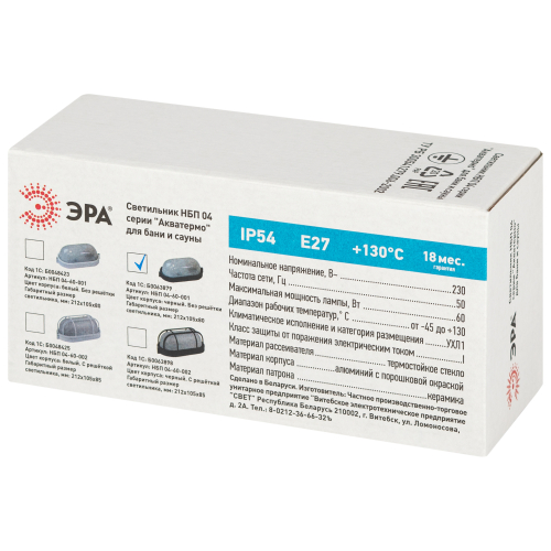 Термостойкий светильник серии "Акватермо". Так называемые светильники-банники имеют специальную конструкцию, позволяющую эксплуатировать эти модели на объектах с повышенным уровнем влажности - бани, бассейны, автомойки, склады, гаражи. Серия "Акватермо" представлена в широком диапазоне параметров (мощность, размеры), некоторые модели дополнены защитной решеткой. Выпускаемые пылевлагозащищенные светильники отличаются надежностью, практичностью, безопасностью, устойчивостью к агрессивным климатическим и механическим воздействиям. Имеют широкий диапазон рабочих температур: от -45°С до +130°С. Материал рассеивателя: селикатное стекло. Материал корпуса: черный алюминий. Источник света: лампа с цоколем Е27. Степень защиты от окружающей среды - IP54.