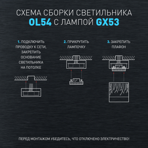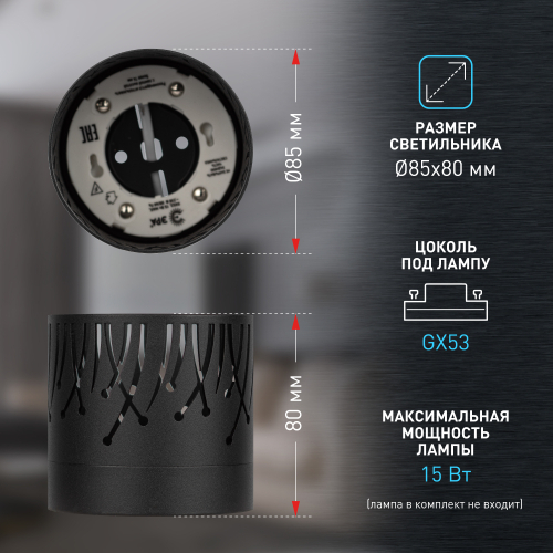 Накладной светильник OL54 BK делает помещение зрительно более стильным и интересным. Используя по периметру несколько однотипных осветительных устройств, можно сформировать интересные световые геометрические рисунки. Цоколь для источника света GX53, напряжение питания ~230В 50/60Гц, материал металл, цвет светильника черный, размер D85x80мм, максимальная мощность лампы 15Вт, степень защиты IP20