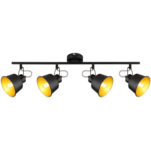 Rivoli Evelyn - настенно-потолочный спот с 4 трендовыми металлическими плафонами. Внешняя сторона плафонов имеет черное матовое покрытие, внутренняя - покрытие золотого цвета. Настенно-потолочные светильники Evelyn отличаются поворотной конструкцией плафонов, позволяющей индивидуально регулировать направление светового потока каждого плафона. В коллекции представлены споты поворотные под 1 лампу (арт. 7064-701), споты поворотные под 2 лампы (арт. 7064-702), споты поворотные под 3 лампы (арт. 7064-703), споты поворотные под 4 лампы (арт. 7064-704). Рекомендуемые источники света - Е14 мощностью 40 Вт. Размер данного настенно-потолочного спота под 4 лампы - 700*114*188 мм. Это прекрасное интерьерное решение для популярного стиля лофт. Освещаемая площадь - 12 м². Настенно-потолочный спот из металла - прочный и надежный. Выглядит очень стильно. Благодаря гальванизации окрашивания защищен от царапин и выцветания. Спешите купить!
