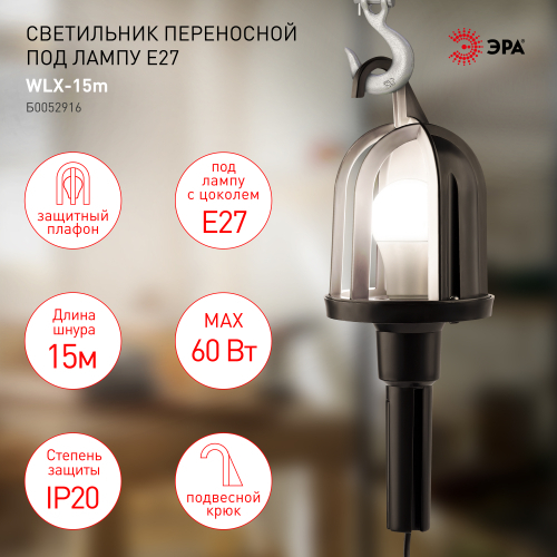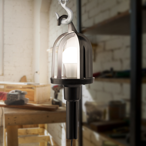 Светильник переносной под лампу с цоколем E27 (рабочая лампа). Предназначен для внутреннего освещения жилых и общественных помещений. Рассчитан для работы в сети переменного тока с номинальным напряжением 250 В и частотой 50 Гц. Максимальная мощность для лампы накаливания 60 Вт. Специальный подвесной крюк позволяет надежно закрепить светильник в момент эксплуатации, что делает его удобным для применения в гаражах или других подсобных помещениях.
