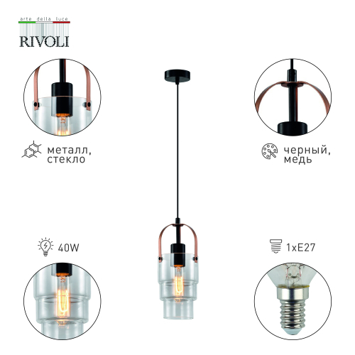 Дизайнерский светильник потолочный подвесной Rivoli Christina (арт. 4110-201) для интерьеров в стиле лофт, кантри, модерн, скандинавский, ретро. Основной цвет светильника подвесного – чёрный, декоративные детали – цвета меди. Трендовое сочетание оттенков и оригинальная композиция плафона делают этот светильник подвесной дизайнерский прекрасным решением для преображения пространства и расстановки стилевых акцентов. Лампа для данного подвеса – Е27 40 Вт. Лучшим решением станет филаментный источник света в ретро-стилистике. Рекомендуем купить лампочку в удлинённой колбе. Высоту светильника подвесного дизайнерского легко отрегулировать при монтаже подвеса на потолок.
