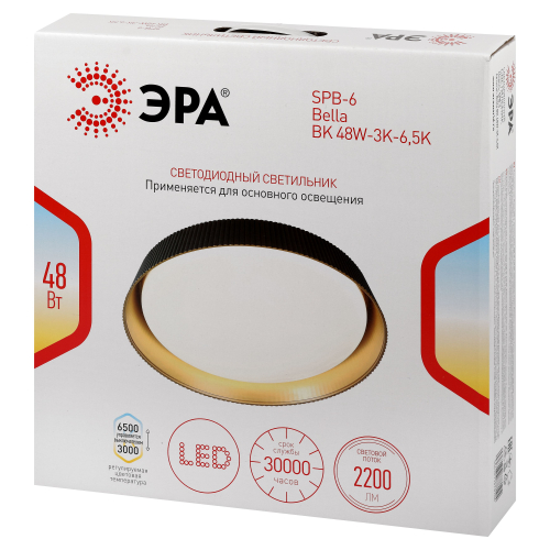 Светодиодный светильник ЭРА SPB-6 Bella 48W-3K-6,5K BK – современное решение для общего освещения жилых и коммерческих помещений.