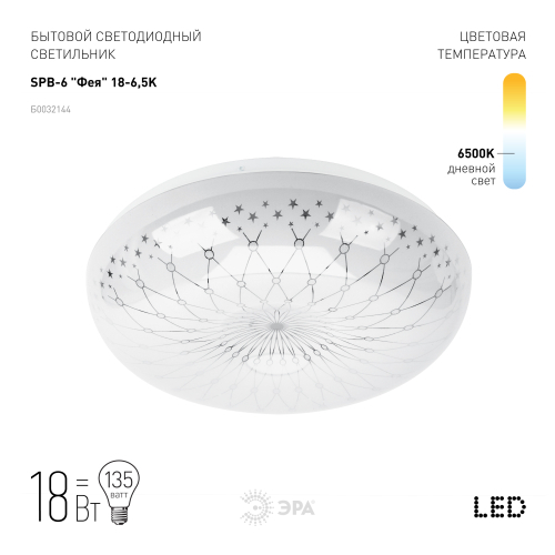 Мощность в 18 Вт и срок службы в 30 000 часов подарят долгую и бесперебойную работу электросветильника SPB-6 "Фея". Купите потолочную люстру ЭРА окружите себя волшебством!