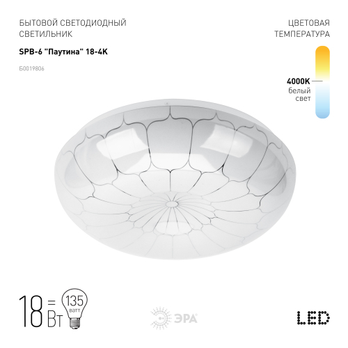 Мощность в 18 Вт и срок службы в 30 000 часов обеспечат долгую работу SPB-6 "Паутина". Приобретайте светодиодную люстру от компании ЭРА создавайте уникальный стиль!