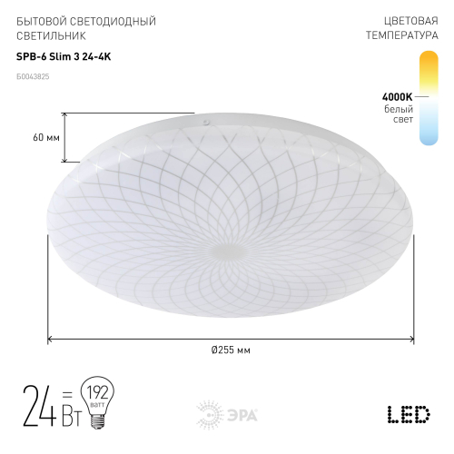 Изящный потолочный светильник SPB-6 "Slim 3" 24-4K от бренда ЭРА прекрасно дополнит любое дизайнерское решение! Наружный диаметр составляет 25 см. Стальной корпус светодиодной люстры обладает противоударными свойствами и отделан глянцем.