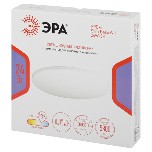Светодиодный светильник ЭРА SPB-6 Slim Base WH 24W-5K – современное решение для общего освещения жилых и коммерческих помещений.