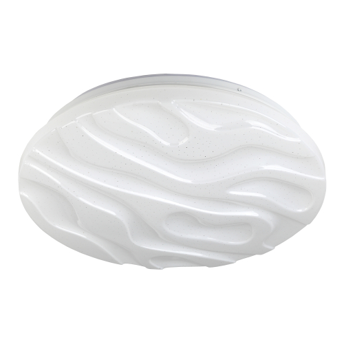 Лаконичный дизайн плафона в виде фактурных волн идеально сочетается с круглым плоским корпусом. За счет эффекта звездного неба в помещении можно создать оригинальную атмосферу. Такой потолочный LED светильник разнообразит интерьер спальни, детской или гостиной.