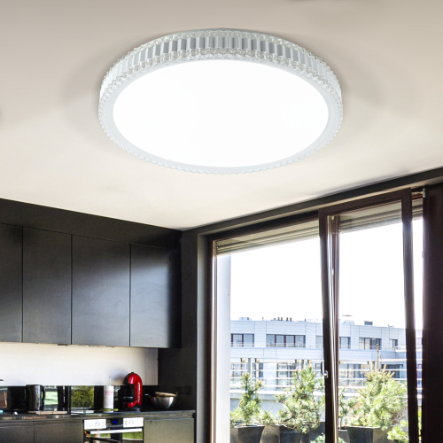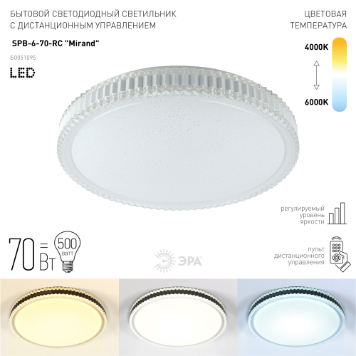 Светильник светодиодный потолочный ЭРА SPB-6-70-RC серии Mirand воплотил в себе сочетание современных технологий освещения и классического дизайна. Рассеиватель светильника выполнен из прочного пластика с особым узором, напоминающим звездное небо. Его обрамляет массивное кольцо "под хрусталь", что создает эффектное свечение на потолке. Такой светильник станет изысканным украшением интерьера, привнесет в него неповторимый колорит. Конструкция светильника состоит из стального основания со светодиодной платой. Диаметр светодиодной лампы составляет 49 см. Цветовая температура регулируется в зависимости от необходимости в пределах от 3000 К до 6000 К, в чем помогает пульт дистанционного управления, яркость свечения также регулируется. Мощность лампы составляет 70 Вт, продолжительность службы 30000 часов.