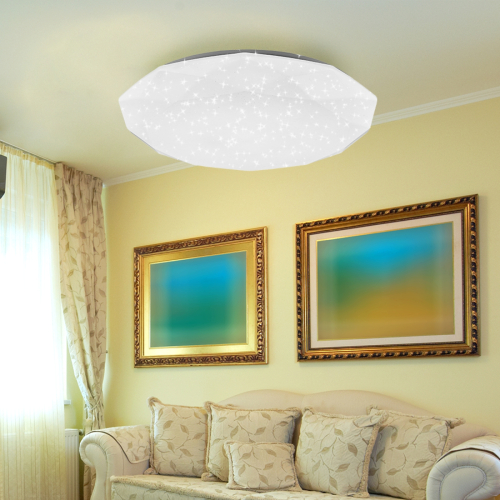 Вместе с потолочным светильником идет пульт управления, с помощью которого Вы легко выберете нужную яркость, цветовую температуру или время отключения (30 мин или 1 ч). Эффектный потолочный светильник работает на светодиодах, которые снижают нагрузку на электросеть и не требуют замены.