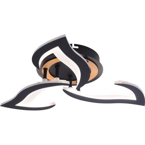 Серия черных светодиодных потолочных светильников с элементами натурального дерева включает модели мощностью 42 и 84 Вт. В комплекте пульт ДУ для удобного регулирования яркости и цветовой температуры от 3000 до 6250 К, позволяя настроить освещение под любые потребности и атмосферу.