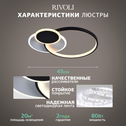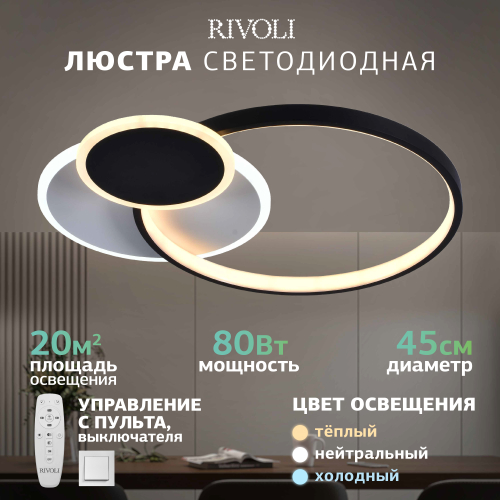 Люстра потолочная светодиодная Rivoli Julia в стильном геометричном корпусе белого и черного цветов. Этот современный LED-светильник на потолок оснащен пультом дистанционного управления и имеет множество полезных функций. Это больше, чем просто люстра на потолок! Это полноценный современный гаджет для тех, кто хочет сделать свою жизнь максимально комфортной. Доступно управление с помощью смартфона.