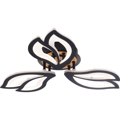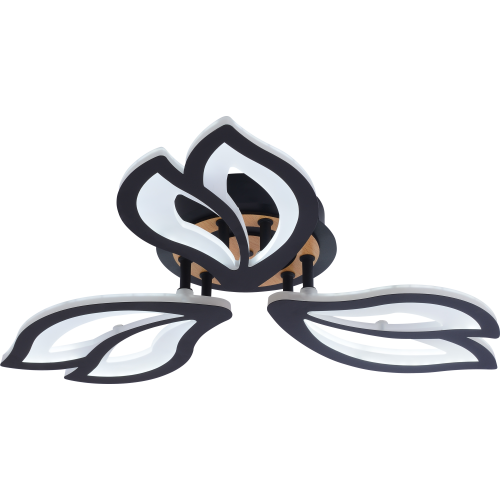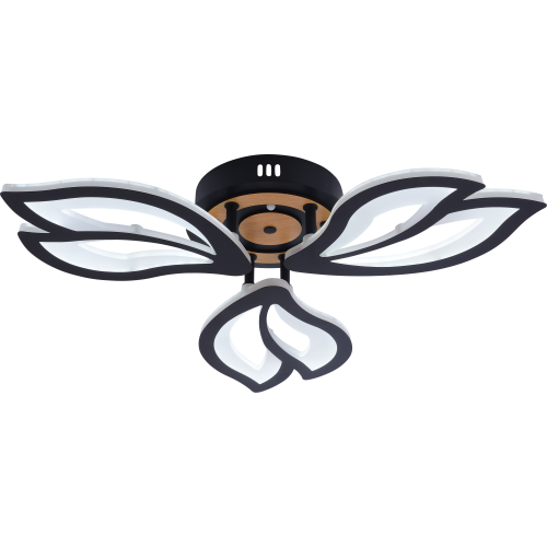 Серия черных светодиодных потолочных светильников с элементами натурального дерева включает модели мощностью 60 и 100 Вт. В комплекте пульт ДУ для удобного регулирования яркости и цветовой температуры от 3000 до 6250 К, позволяя настроить освещение под любые потребности и атмосферу.