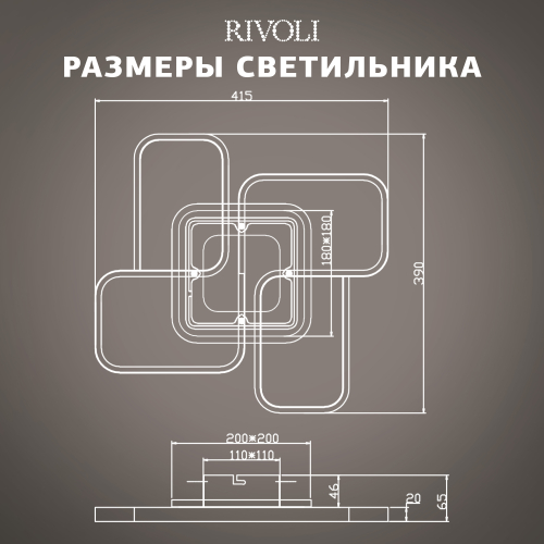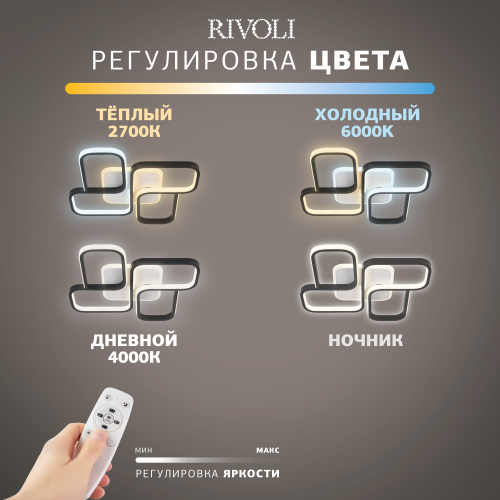 Дизайн люстры светодиодной на потолок Rivoli Lydia 6104-101 LED – квадратный. Бренд Rivoli предлагает аналогичный светодиодный LED-светильник потолочный в круглом дизайне - Rivoli Lori (арт. 6103-101). Светодиодные потолочные люстры Rivoli дают возможность выбирать яркость освещения и цветовую температуру света.