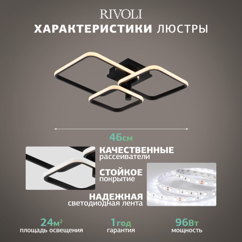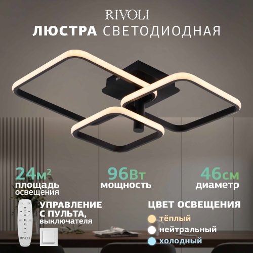 Светодиодный потолочный светильник Rivoli Milena с пультом управления в комплекте. LED-светильники — одно из самых популярных решений организации основного освещения. Это многофункциональный современный аналог традиционной люстры. В коллекции Milena итальянского бренда Rivoli представлены LED-люстры потолочные с квадратными (арт. 6141-103) и круглыми (арт. 6141-101) плафонами. Геометричный дизайн этих светодиодных люстр отлично смотрится в современных интерьерах. Актуальный чёрный цвет корпуса светильников LED потолочных Rivoli Milena позволяет создать акцентное пространство с контрастными деталями.