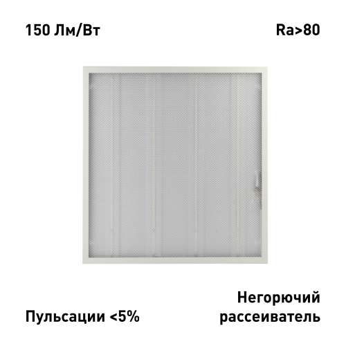 Отличаются высокой светоотдачей, что позволяет эффективно заменять данными светильниками люминесцентные светильники 4х18 1-в-1 без потери уровня освещённости. Высокая энергоэффективность 150 Лм/Вт обеспечивает быструю окупаемость и низкое энергопотребление. Комфортное для глаз человека освещение создаётся благодаря качественной цветопередаче с индексом (CRI / Ra > 80) и отсутствию пульсаций (коэффициент