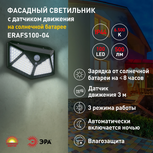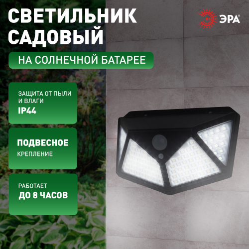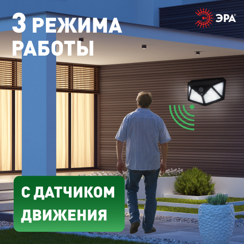 Фасадный светильник ERAFS100-04 станет изящным источником света для вашего дома, террасы, беседки, гаража. Беспроводной LED светильник имеет 3 режима работы: постоянного свечения, подсветки и реакции на движение. Статический режим начинает свою работу с наступлением темноты. Реакция на движение подразумевает загорание светильника на 30 секунд при появлении движения в радиусе 3 м. Четыре плоскости освещения обеспечивают максимально ровное распределение света. Главный плюс подсветки для сада - встроенный датчик движения. Свет не будет мешать и просто так освещать пустое пространство. Освещение вашего участка может длиться непрерывно в течение 8 часов. Высокая степень защиты от пыли и влаги позволяет оставлять садовый светильник на улице в дождливую погоду. Высококачественные LED не требуют замены на протяжении всего использования устройства. Работа на солнечной батарее является наиболее экологичной, энергоемкой, а также бесшумной. Декоративный светильник от бренда ЭРА - лучший вариант для преображения вашего участка.