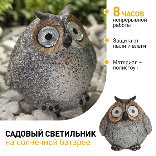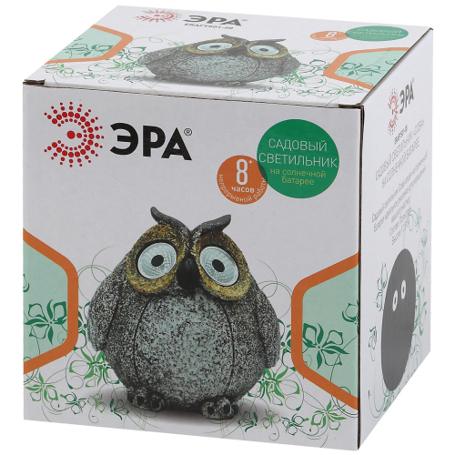 Садовый светильник на солнечной батарее ERAFYS01-08 "Сова" станет прекрасным украшением вашего сада. Небольшие размеры позволят Вам разместить дачную подсветку в палисаднике, украсить пруд, веранду, изящно подсветить аллею или вход в дом. Фигурка из полистоуна высотой 11,5 см с легкостью устанавливается в землю. Садовый светильник функционирует на солнечной батарее. Такой тип получения энергии является наиболее экологичным, энергоемким, а также бесшумным. Питание происходит во включенном режиме, в светлое время суток. После захода солнца маленькая сова "просыпается". Территория вокруг нее освещается холодным белым светом, исходящим из глаз. Создается настоящая атмосфера волшебства. Необычный стиль корпуса придает фигурке причудливый стиль. Солнечная батарея предусматривает 8 часов непрерывной работы. Высокая степень защиты от пыли и влаги позволяет оставлять садовый светильник на улице даже во время дождя. Обращаем Ваше внимание, что перед использованием фигурки её необходимо включить и зарядить. Светильник заряжается в течение всего светового дня. Подсветка на солнечной батарее ERAFYS01-08 "Сова" от компании ЭРА лучший вариант для преображения Вашей дачной территории.