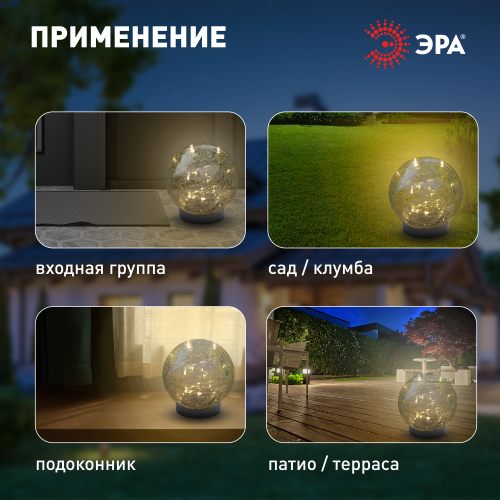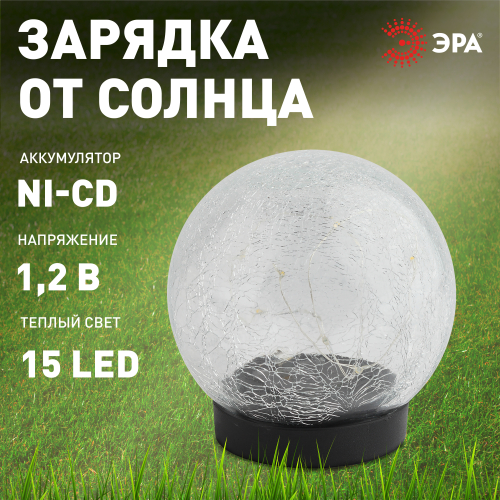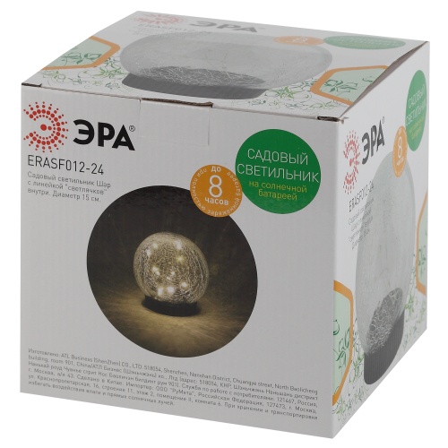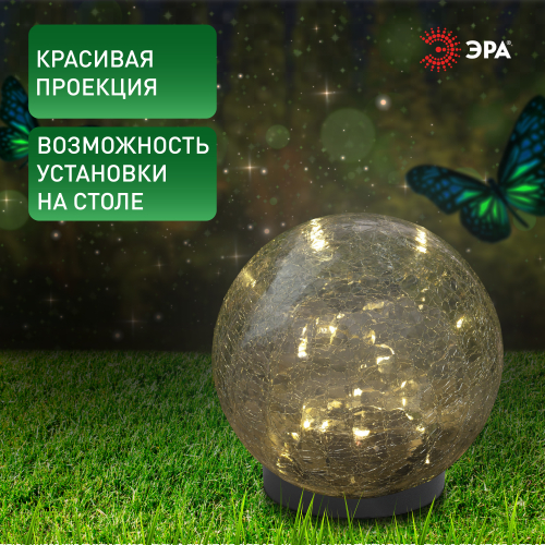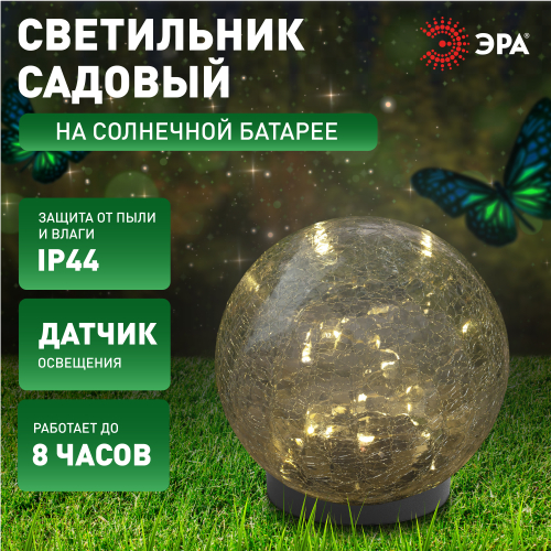 Волшебный садовый светильник шар ERASF012-24 станет эффектным источником света на Вашей загородной территории. Небольшие размеры позволят Вам спрятать светильник в саду, украсить прудик или бассейн, необычно подсветить цветы, аллею или вход в дом. Фигурка из пластика диаметром 15 см с легкостью устанавливается в землю. LED светильник функционирует на солнечной батарее. Данный тип получения энергии является самым экологичным, энергоемким, а также бесшумным. Питание происходит во включенном режиме, днем. С наступлением ночи шар загорается теплым белым светом. Создается ощущение, что внутри мелькает множество светлячков. Атмосфера волшебства окутывает территорию. Солнечная батарея предусматривает 8 часов непрерывной работы. Высокая степень пыле и влагозащиты, а также ударопрочность позволяют оставлять светильник в саду в непогоду. Обращаем Ваше внимание, что перед использованием фигурки её необходимо включить и зарядить. Светильник заряжается в течение всего светового дня. Садово-парковый светодиодный светильник шар от компании ЭРА чудесный вариант для украшения Вашей территории. Данный уличный декоративный светильник от торговой марки ЭРА применялся для преображения дачного участка в телевизионной передаче Первого канала "На дачу!"
