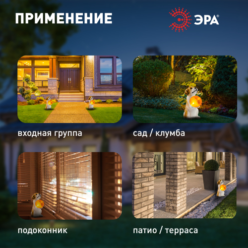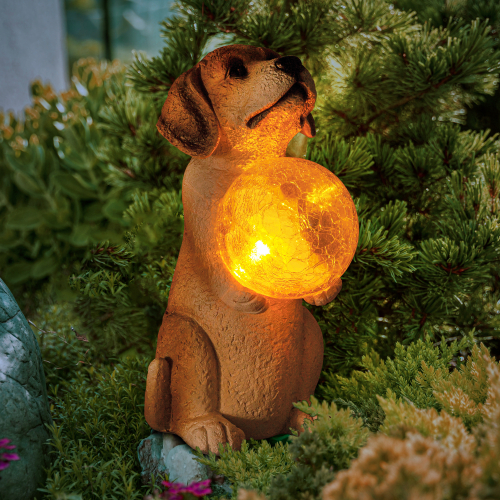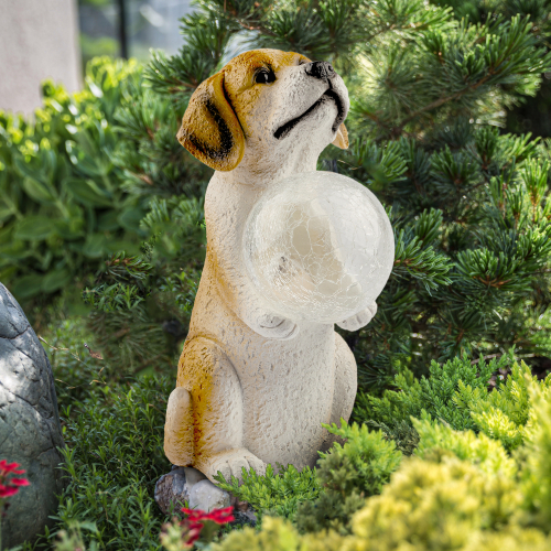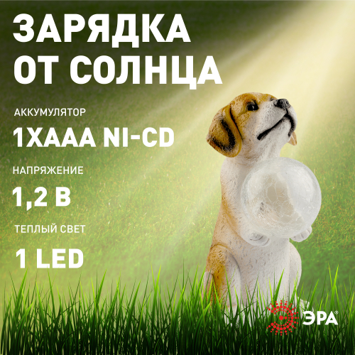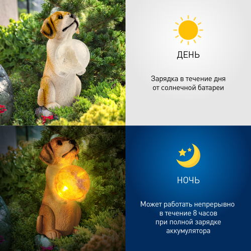 Фигурка садовая декоративная ЭРА "Золотистый ретривер" в виде забавного щенка со светильником-шаром станет милым обитателем Вашего загородного дома! Этот уличный светодиодный светильник можно разместить разместить на дачном участке - в палисаднике, украсить беседку, веранду, кустарник, изящно подсветить аллею или вход в дом. Фонарь ERASF22-011 высотой 27 см выполнен из полистоуна, все детали хорошо проработаны. Беспроводной садовый светильник работает на солнечной батарее, этот тип получения энергии является самым экологичным, энергоемким, а также бесшумным. Питание происходит во включенном режиме в солнечную погоду, фигурка сама загорается, как только стемнеет, и работает до 8 часов. При желании фонарик можно вытащить из лапок щенка. Шар с теплой подсветкой добавит уюта Вашему вечеру!