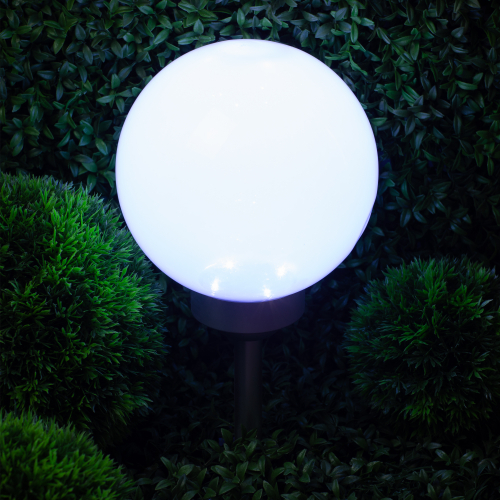Классическая модель садового светильника в виде сферы. Мягкое свечение холодного белого света послужит прекрасным украшением при оформлении садовых дорожек и клумб.