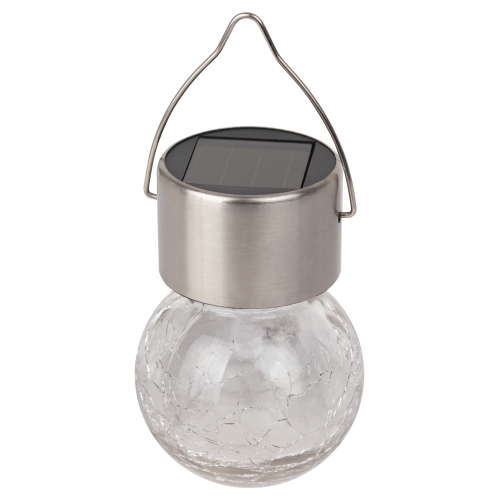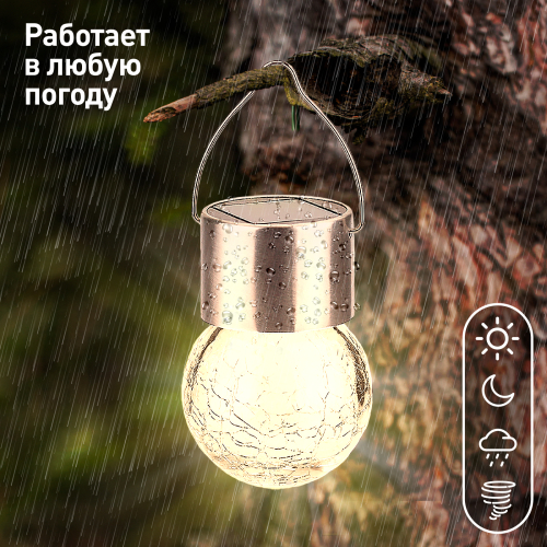 Подвесной светильник-ламочка с эффектом кракле ЭРА ERASF22-32 (арт. Б0053384). Диаметр светодиодного шара - 6 см. Металлическая ручка-подвес позволяет с комфортом применять данный уличный светильник. В дневное время садовый светильник подзаряжается естественным способом с помощью встроенной солнечной батареи, вечером автоматически включается, создаёт яркую дополнительную подсветку и красивый световой узор. Подвесная садовая LED-лампочка работает в любую погоду. Высокая защита от влаги и пыли - IP54. За счёт использования солнечной энергии для питания светильник ЭРА "Лампочка" можно размещать в любом уголке сада, перемещать с места на место.