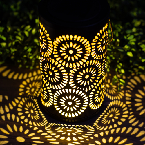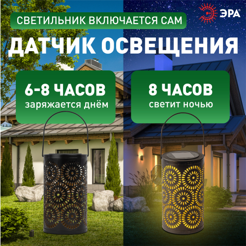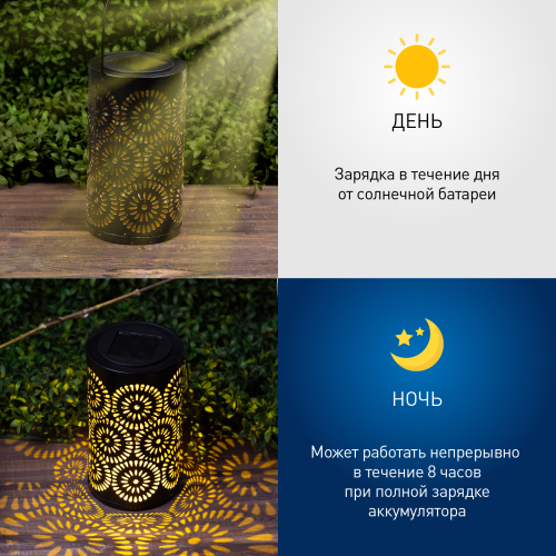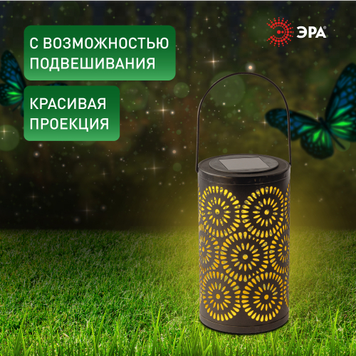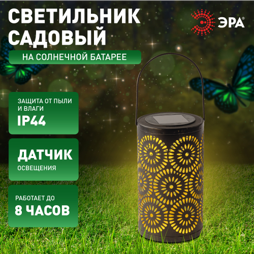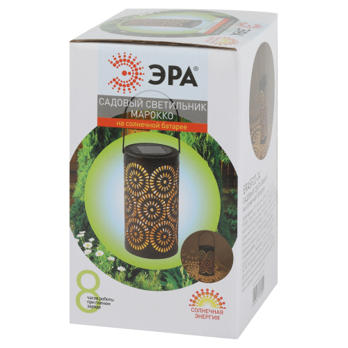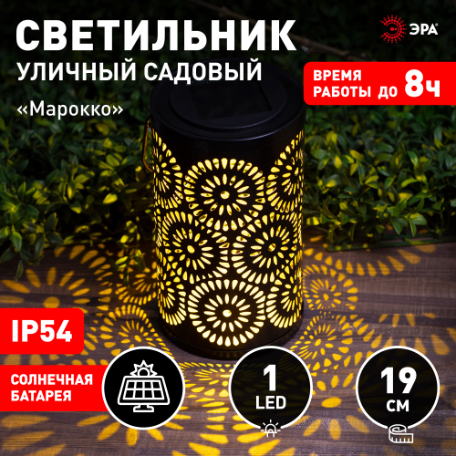 Всепогодный садовый светильник ЭРА ERASF22-34 (арт. Б0053386) в марокканском стиле. Создаёт интересную подсветку в виде световой проекции на поверхность и окружающие предметы. Высота светильника садового на солнечной батарее - 19 см. Корпус из высокопрочного пластика, металлическая ручка для переноса и подвеса, поликристаллическая солнечная панель. Светильники садовые ЭРА "Марокко" применяются на загородном участке очень широко: их пожно поставить на стол в беседке, установить у клумб и альпийскийх горок, подвесить на ветки кустарников и деревьев, украсить ими лестницу или крыльцо. Тёплое уютное свечение создаст в саду расслабляющую вечернюю атмосферу.